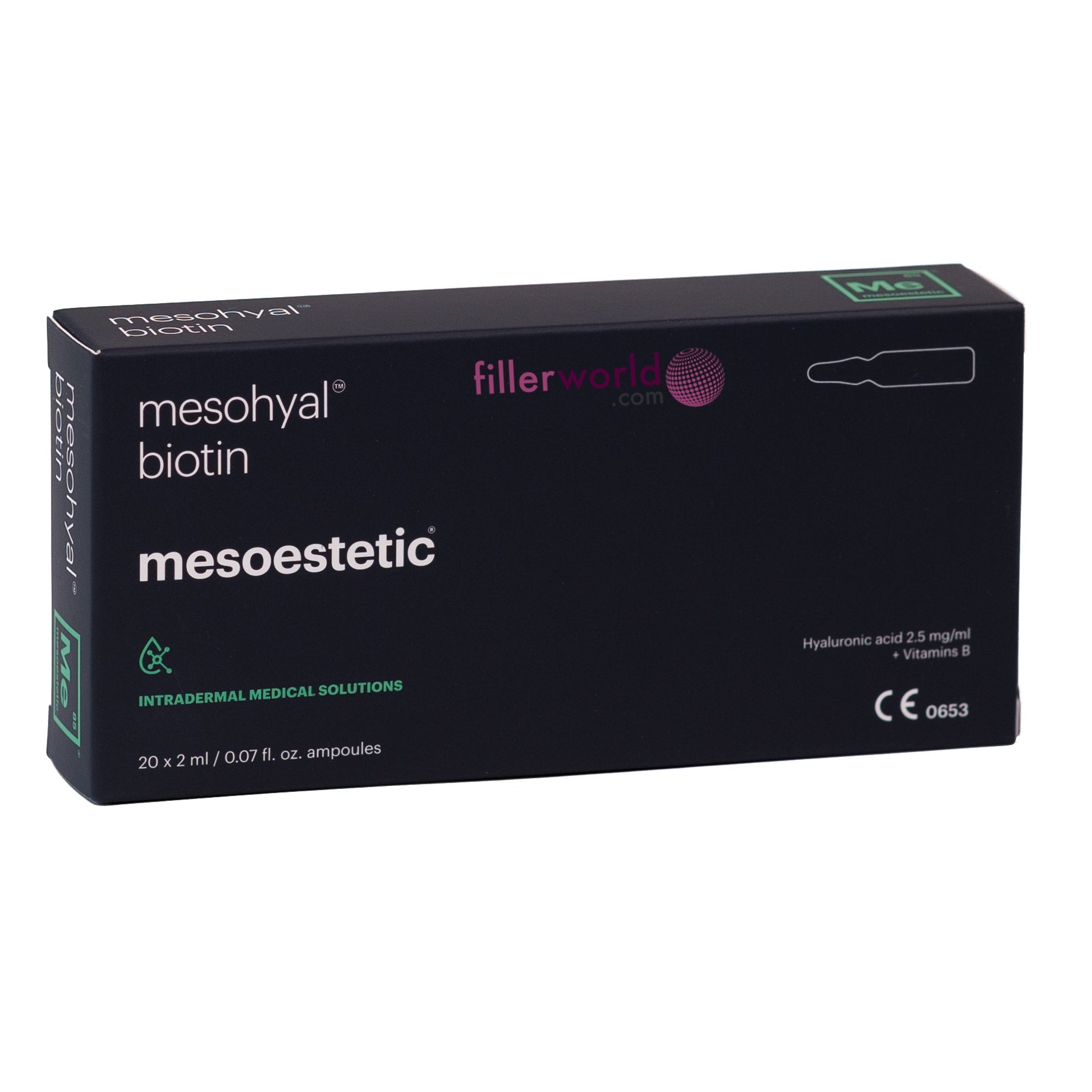 Mesohyal Biotin is a revitalizing treatment based on blend of 0.5% vitamin B8, mineral salts and non-crosslinked hyaluronic acid. It is indicated as a treatment for reactivation of epidermal cell metabolism and scalp, alopecia, antiaging and seborrheic dermatitis. Mesohyal Biotin contains Vitamin B8 which boosts micro flow and reactivate the metabolism of proteins, cells, fats and carbohydrates, slows down the skin aging process. Also, it catalyzes fixation of carbon dioxide in the conjunction of fatty acids, inhibiting the skin ageing processes and reactivating cell metabolism. Moreover, Biotin growths the concentration of vitamins, proteins and minerals existing in the dermis. This amazing function provides you face a new shine and brightness, but also allows it to nourishes hair fibre and helps create healthy and strong hair.